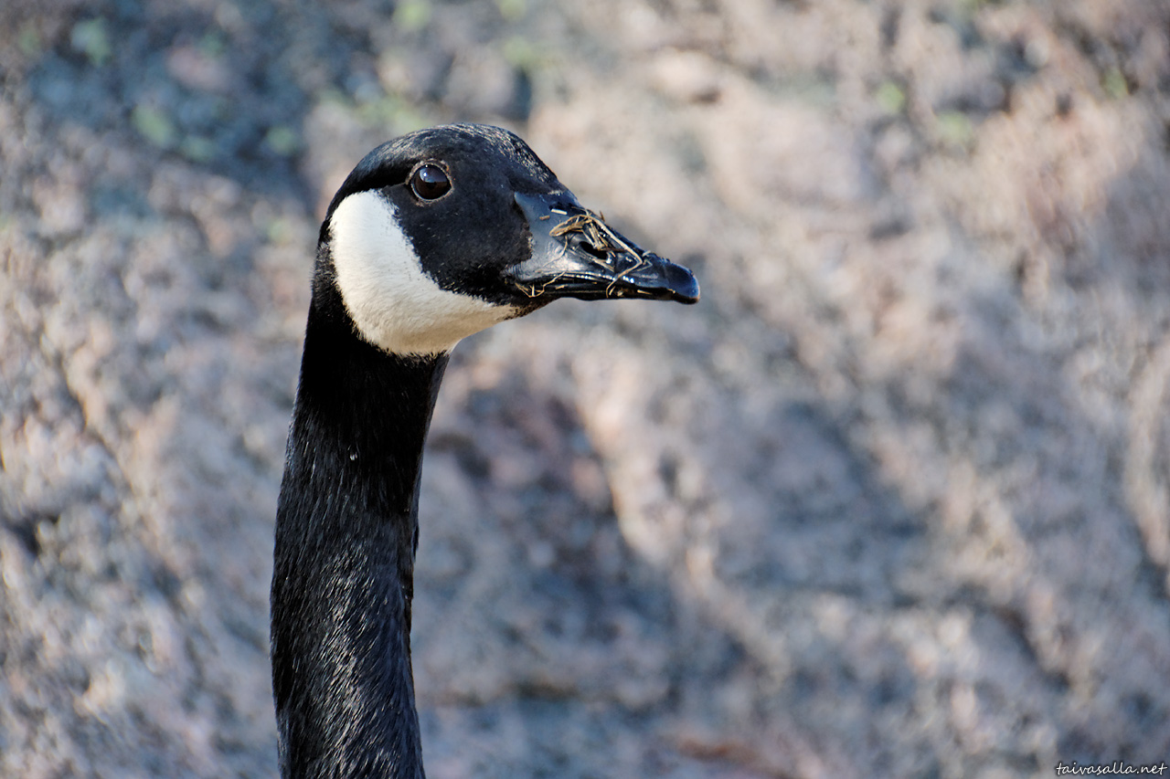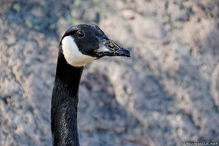 Helsinki: Kanadanhanhi tarkkailee valokuvaajaa kesken ruokailunsa Seurasaaren kaakkoisrannalla kauniina kevätpäivänä.