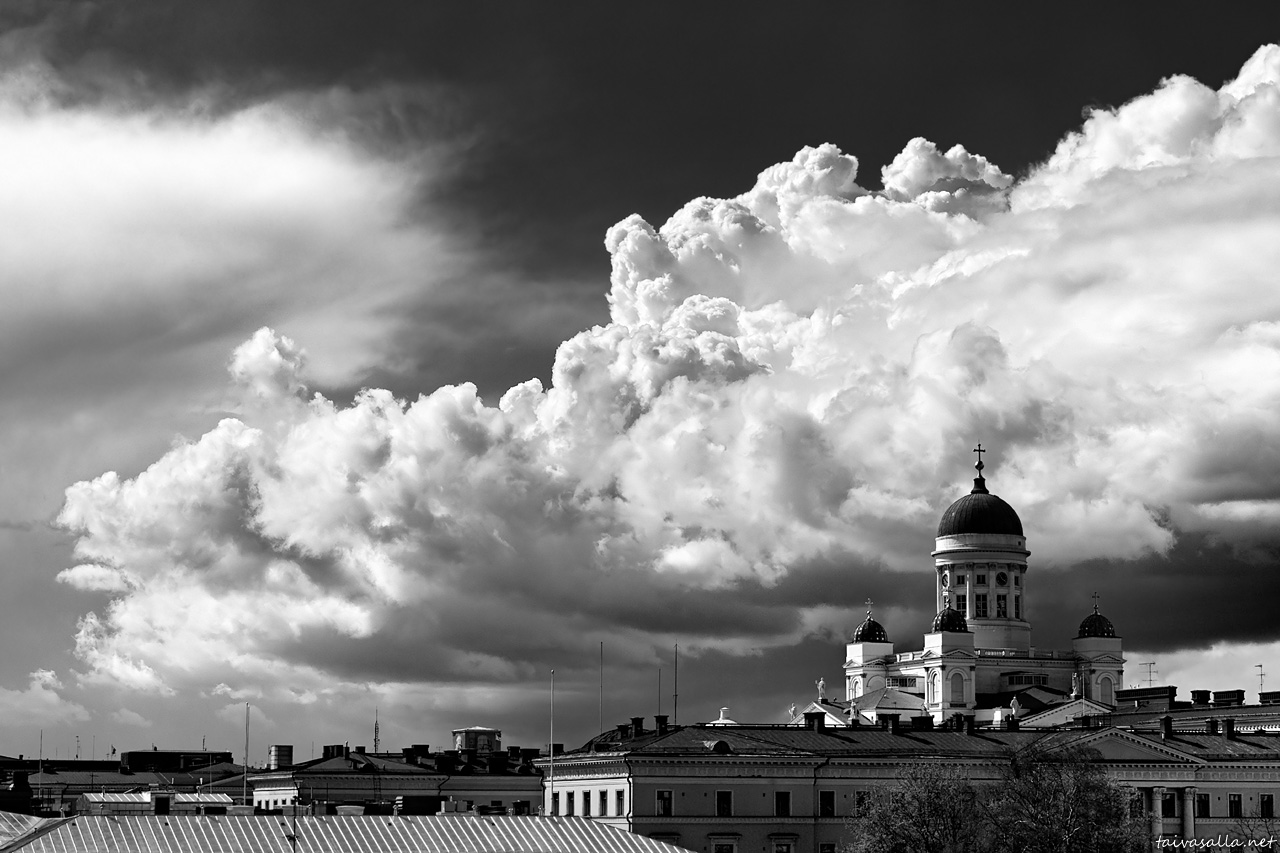 Joka tapauksessa musta-valkoisuus toimii tässä tehokkaasti! Tuomiokirkkommekin ei niin tyypillisestä vinkkelistä.