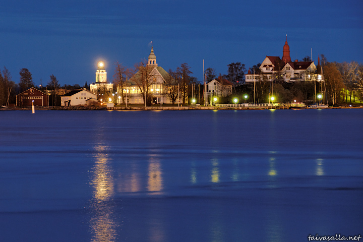 Helsinki: Suomenlinnan, Valkosaaren ja Luodon rakennuksia vedestä heijastuvine valoineen. Kuvattu kevätillan hämärissä Kauppatorin rannasta Eteläsatamasta.