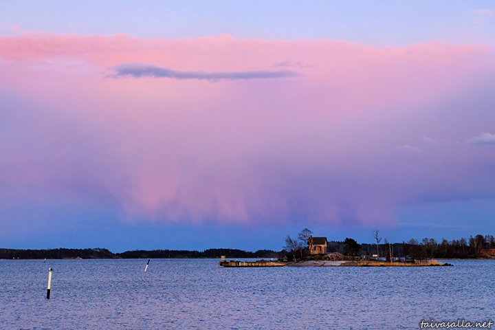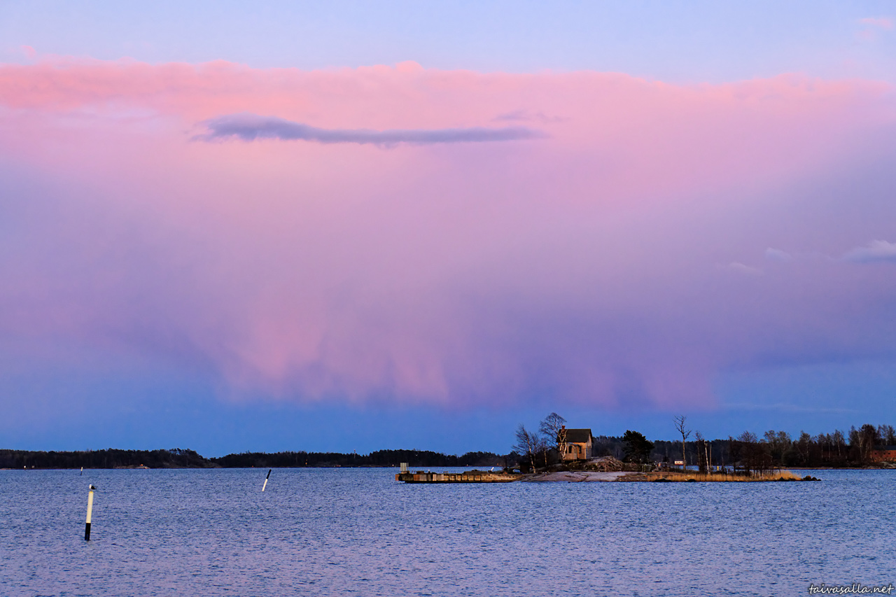 Mahtavan hienot värit tässä, sekä tunnelma joka on jotenkin uhkaava mutta kuitenkin samalla rauhallinen. Oisi kiva olla tuossa mökissä saaressa. Kesä siis tulee kuin tuleekin kun on eka ukkonenkin koettu.