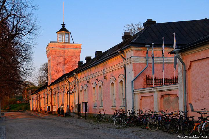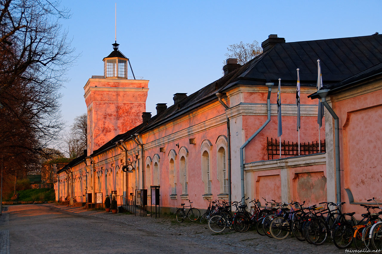 Helsinki: Rantakasarmi C1 hehkuu kevätillan viimeisessä auringonvalossa Suomenlinnan Isossa Mustasaaressa.