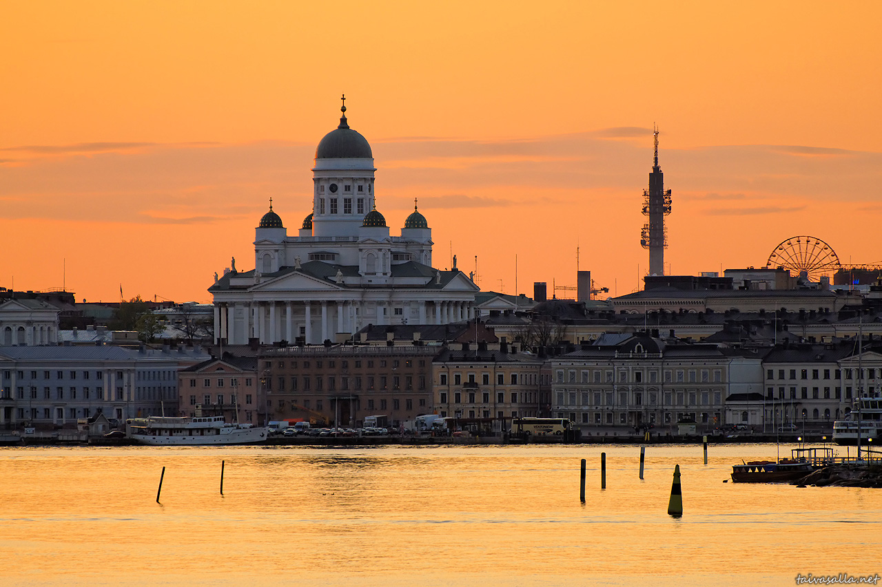 Helsinki: Kevätillan näkymä Eteläsataman yli kohti Kauppatoria ja Kruununhakaa Suomenlinnan Länsi-Mustasaaresta. Kymmenisen minuuttia ennen auringonlaskua otetussa kuvassa aurinko paistaa vielä Tuomiokirkon kellotorniin.