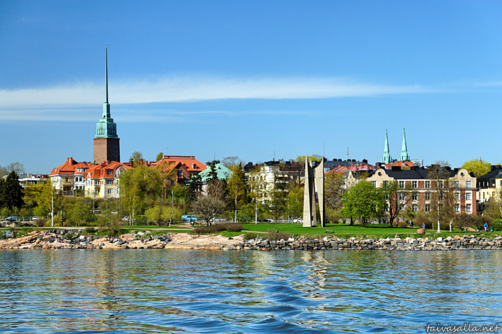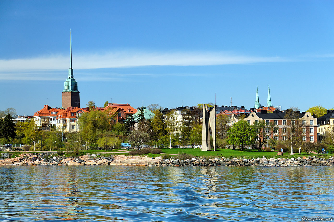 Helsinki: Aurinkoisen kevätpäivän näkymä mereltä kohti Ursininkalliota ja Eiraa. Vasemmalla kohoaa Mikael Agricolan kirkon torni, ja oikealla pilkottavat Johanneksenkirkon kaksoistornit. Edustan nurmikolla puolestaan kohoaa betoninen Merenkulun muistomerkki.
