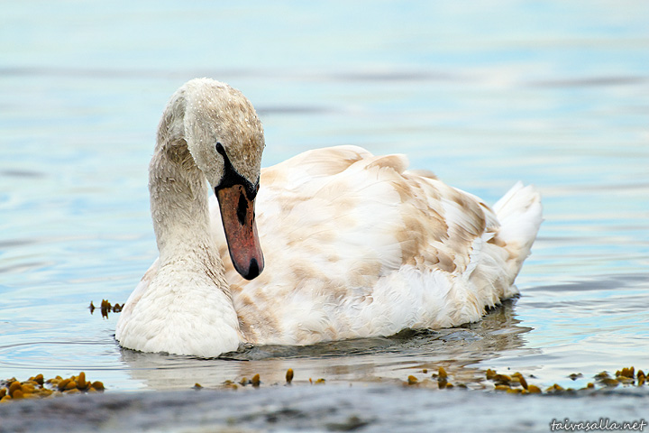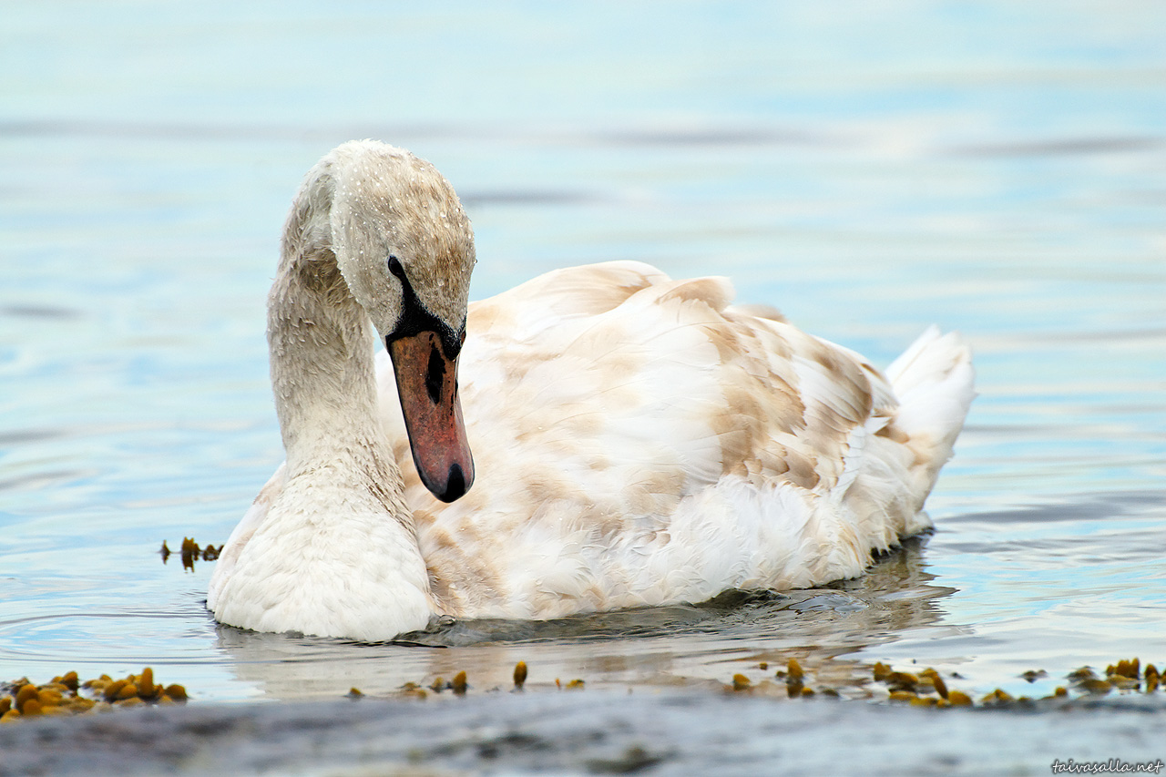 Helsinki: Nuori kyhmyjoutsen Läntisen Pihlajasaaren etelärannan tuntumassa. Viime kesänä kuoriutunut kyhmyjoutsen on juuri saamassa aikuisille linnuille tunnusomaisen ulkonäkönsä oranssin värisine nokkineen ja valkoisine höyhenpukuineen.