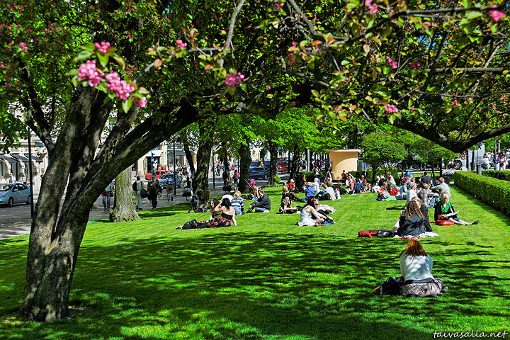 Helsinki: Lämpimän kevätpäivän viettoa Esplanadin puistossa. Etualalla kukkiva puu ja sitä ympäröivä maisema näyttivät sangen erilaisilta 24.11.2008.