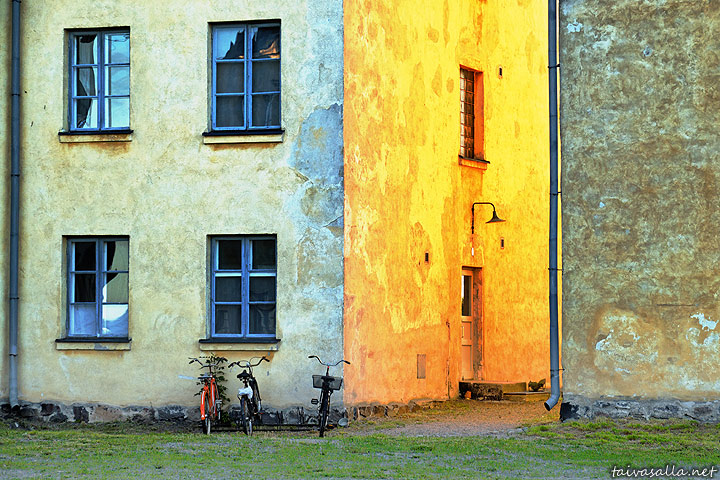 Helsinki: Kesäillan auringonvaloa rakennusten E 4 ja E 5 välissä Länsi-Mustasaaressa Suomenlinnassa. Valo heijastuu oikeanpuoleisen rakennuksen seinästä, joka ei näy kuvassa.