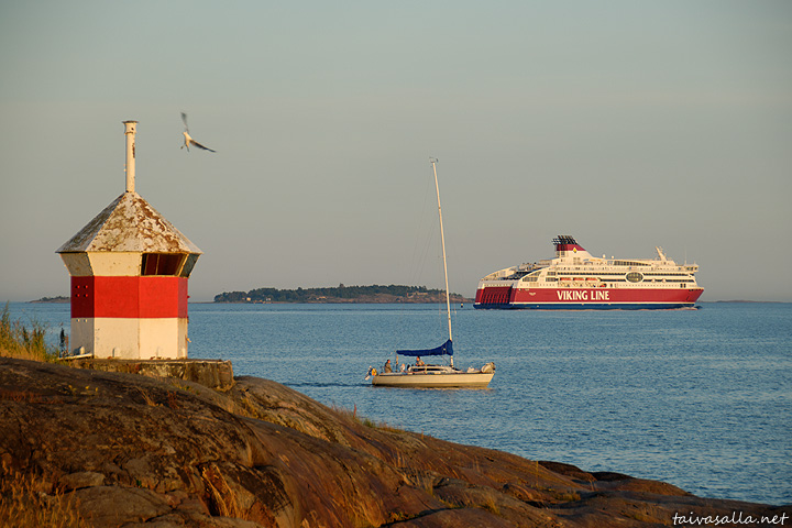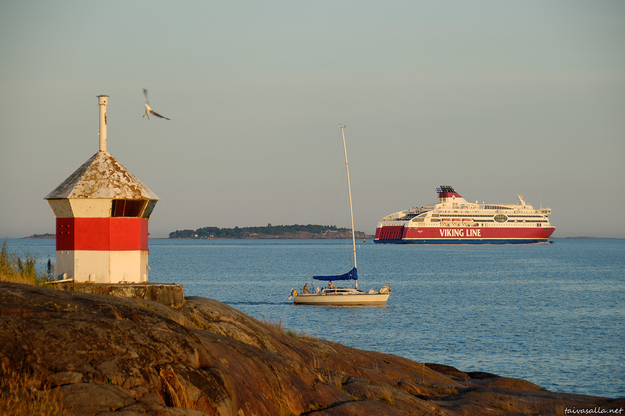 Helsinki: Kesäillan näkymä Länsi-Mustasaaren rantakalliolta Suomenlinnasta. Taustalla näkyy puolustusvoimien hallinnoima Kuivasaari ja Tallinnaan suuntaava Viking XPRS. Edustalla näkyvän loiston kuvasin viimeksi 29.3.2008.