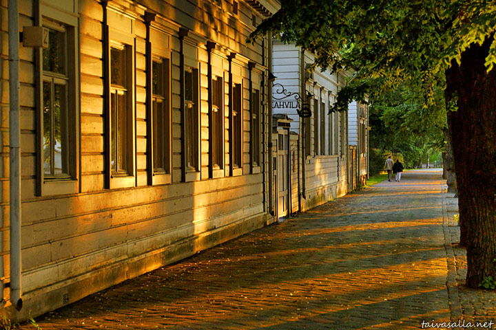 Helsinki: Kaisaniemenrannan puutalot kylpevät kesäisen ilta-auringon lämpimässä valossa. (Muita kuvia samoista taloista: 20.5.2003, 4.7.2004 ja 3.6.2007.)