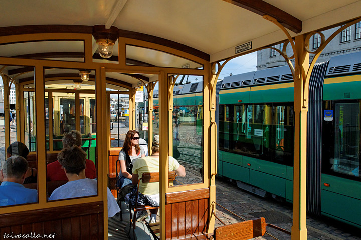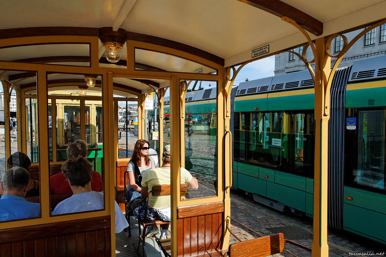 Helsinki: Näkymä vuoden 1919 avoperävaunusta Kauppatorilta, josta ajettiin museoratikkaliikennettä elokuun viikonloppuina. Juuri entisöidyllä avoimella kesävaunulla oli viimeksi päässyt matkustamaan olympiakesänä 1952. Seuraavan kerran vaunu liikennöi kesällä 2010, ks. Stadin Ratikat.