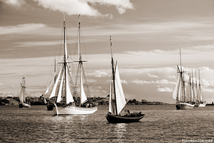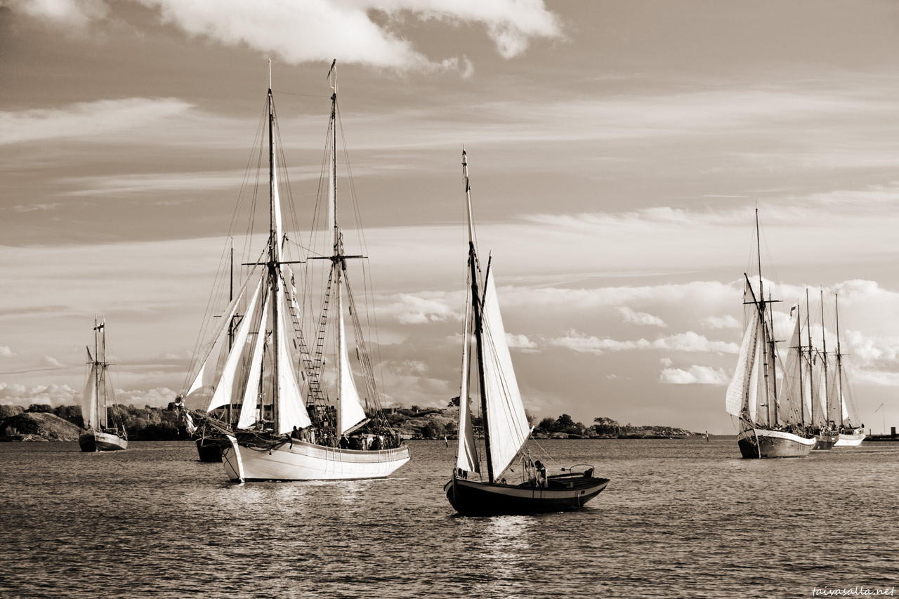 Helsinki: Perinteisiin purjelaivapäiviin osallistuneita aluksia Eteläsatamaan suuntautuneessa Purjeiden paraatissa. Kuva on otettu Ehrenströmintien varrelta Kaivopuiston rannasta kohti Suomenlinnaa.