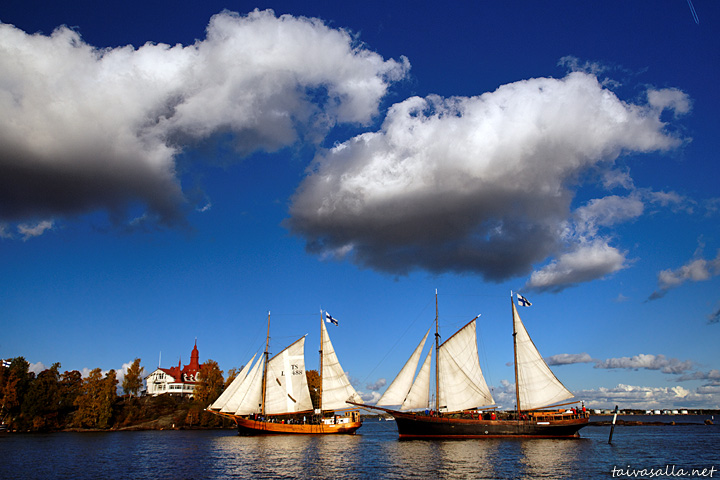 Helsinki: Astrid and Ingeborg, two of many sailing ships participating in an annual sailing ship event arranged in the South Harbour. Photo taken from the shore of Kaivopuisto district with the island of Luoto in the background.