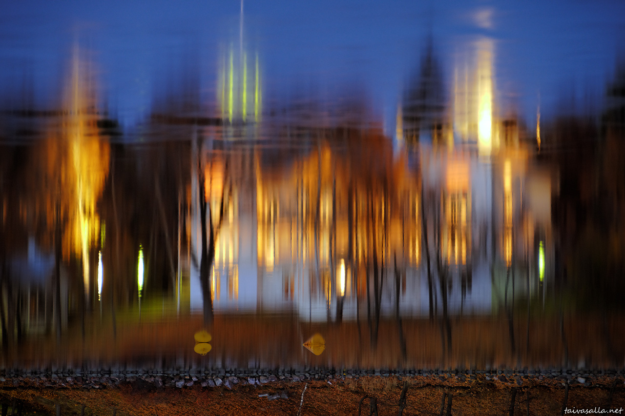 Helsinki: The reflection of Villa Kivi, one of the Eläintarha villas situated on the eastern shore of Töölönlahti inlet, seen from the opposite side of the bay on a calm autumn evening.