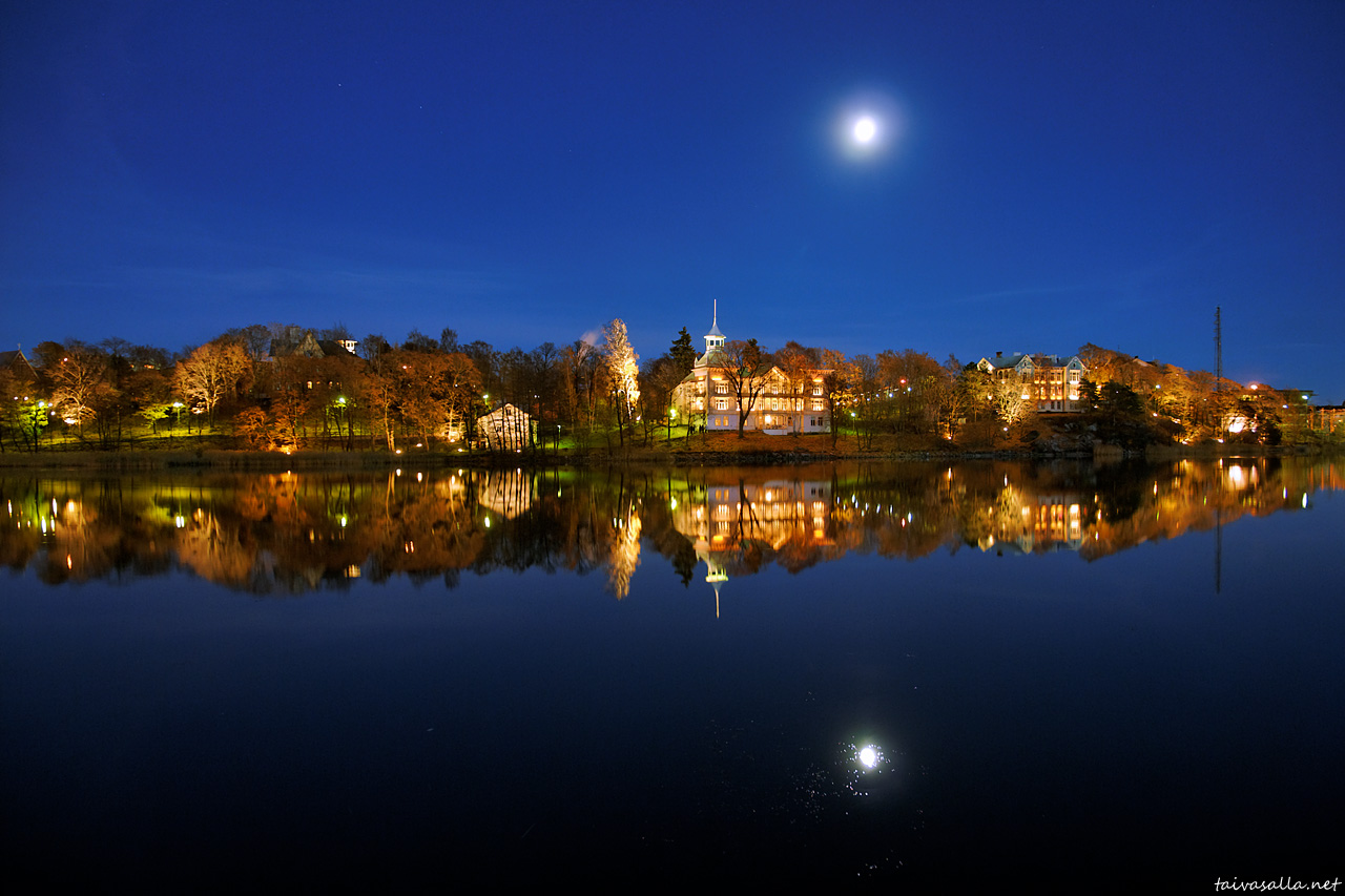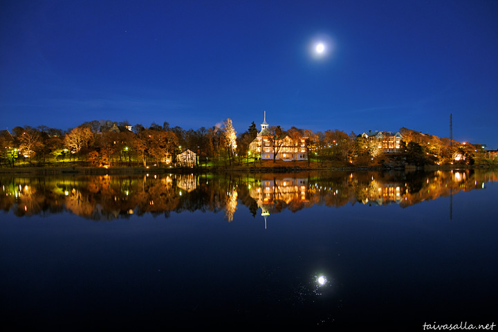 Helsinki: Eläintarhan huvilat ja nouseva kuu heijastuvat Töölönlahden tyynestä vedestä syysillan sinisessä hämärässä. Keskellä näkyy edellisessä kuvassa heijastuksena esiintynyt Villa Kivi.