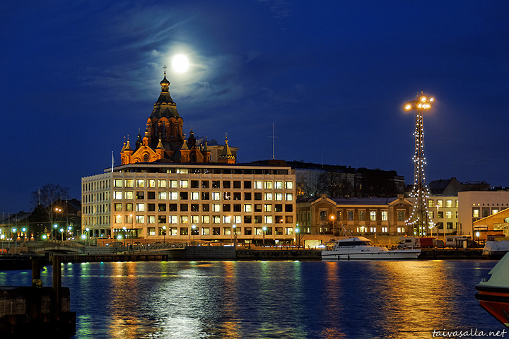 Helsinki: Hämärtyvän talvi-illan näkymä Vironaltaan laidalta Eteläsatamasta kohti Katajanokkaa. Kuu on edennyt hieman edellisen kuvan tilanteesta, jossa se oli Uspenskin katedraalin huipulla.
