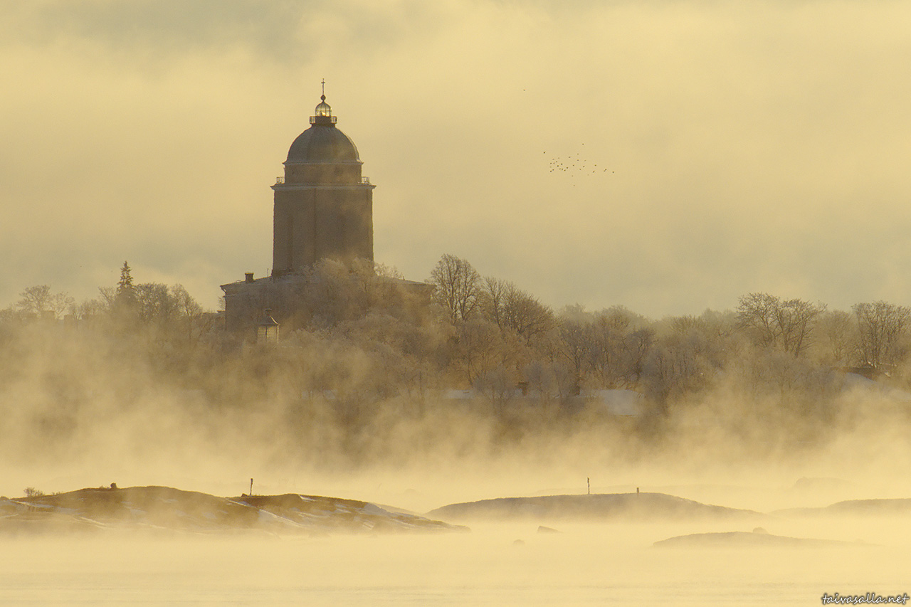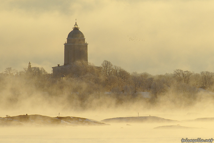 Helsinki: Kylmän talviaamun merisavua Suomenlinnan kirkon ja Ison Mustasaaren ympärillä. Kuvattu Suomenlinnan lautalta Eteläsataman edustalta.