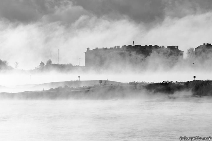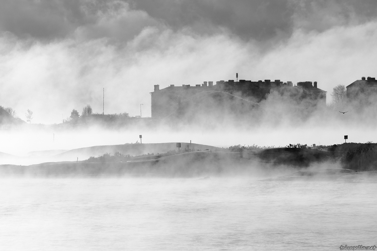 Helsinki: Kylmän talviaamun merisavua Kruunuvuorenselällä kuvattuna Suomenlinnan lautalta. Edustalla näkyvät luonnonsuojelualueeseen kuuluvat Puolimatkansaari ja Pormestarinhepo, ja taustalla Suomenlinnan Länsi-Mustasaari sekä kesäisissä olosuhteissa 18.7.2009 kuvaamani asuinrakennukset.