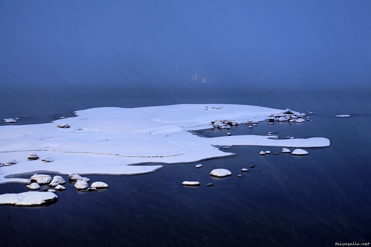 Hieno alkutalven tunnelma Kaivarin rannasta. Samettinen sininen leviää kaikkialle, paitsi katuvalon valaisemalle luodolle. Meri on vielä auki ja lumikin näyttää ihan uudelta.