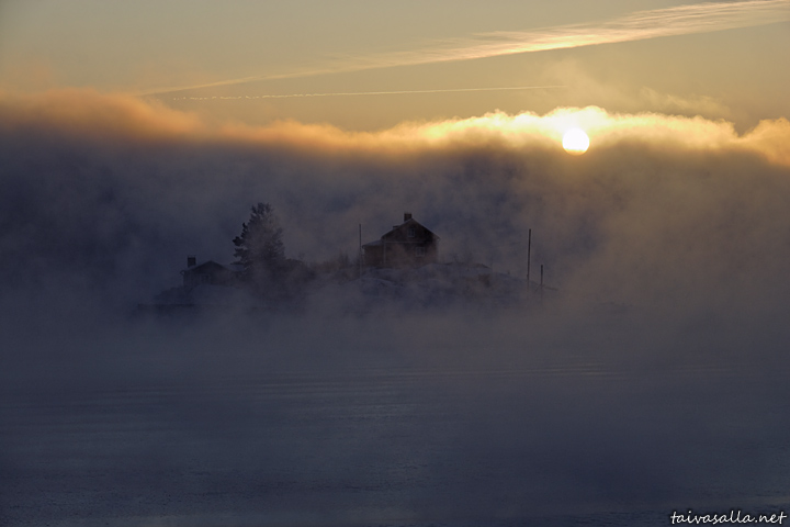 Helsinki: Merisavu ympäröi Eteläsataman edustalla sijaitsevaa Ryssänsaarta kylmänä talviaamuna Suomenlinnaan lautalta otetussa kuvassa.
