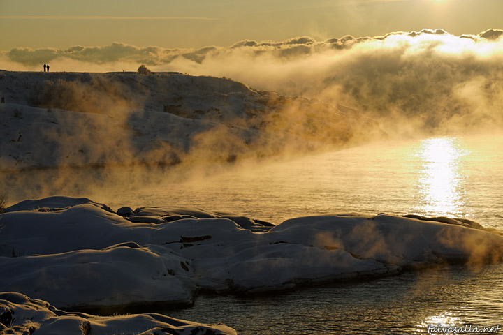 Helsinki: Suomenlahdelta ajautuvaa merisavua Suomenlinnan Susisaaren ja Kustaanmiekan ympärillä kylmänä talviaamuna.