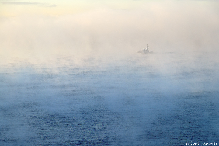 Helsinki: Merisavun ympäröimä luotsivene kuvattuna Kustaanmiekan saaresta Suomenlinnasta kylmänä talviaamuna.