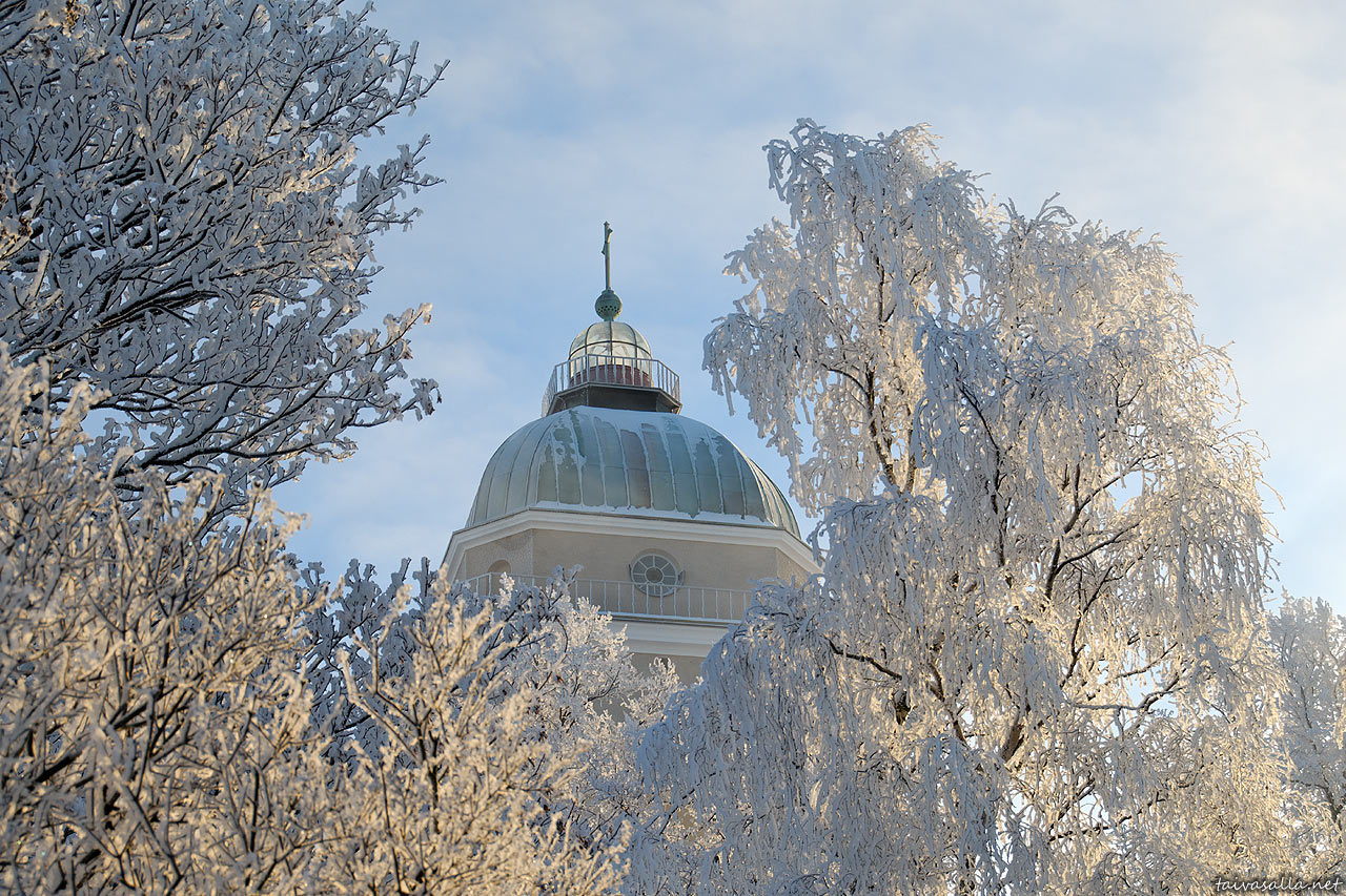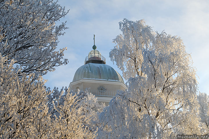 Uusi kirkko, kahdeksankulmainen kupoli näyttää yhtä hauraalta kuin kuura oksissa. Ihanat juhlavärit.