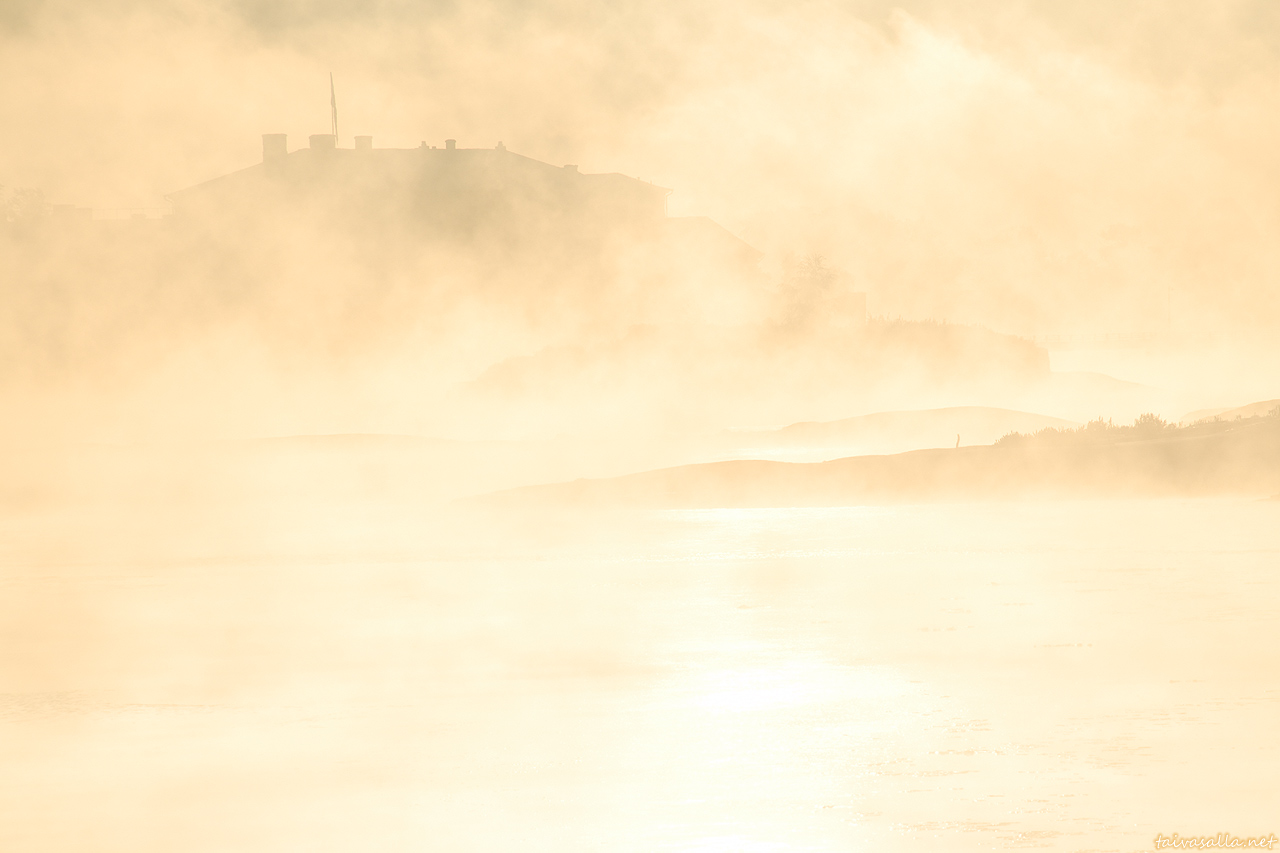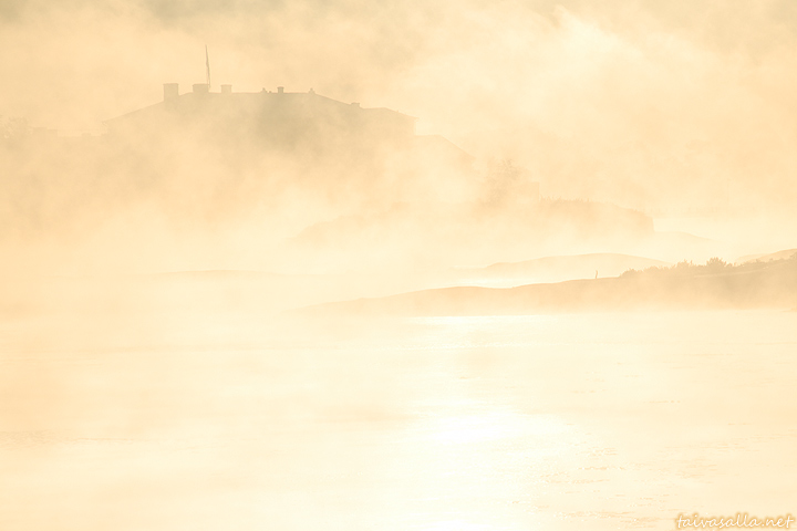 Kiitos kommenteistanne! Arvasin että kuva herättäisi ristiriitaisia ajatuksia, ja oikeastaan siksi päätinkin julkaista sen. Tämä lienee "luomuin" tuona aamuna ottamistani kuvista. Jujuna on voimakas zoomi, eli keskittyminen maiseman pieneen kaistaleeseen. Ymmärrätte mitä tarkoitan katsoessanne seuraavaa kuvaa, jossa kaistale näkyy matalana, kellertävänä sumunauhana horisontin ympärillä.