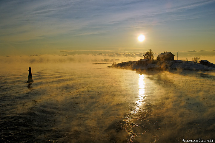 Näyttää kylmältä, toivottavasti mökissä on lämmintä. Sumu näyttää isolta aallolta. Hui, jo se oisikin aalto.