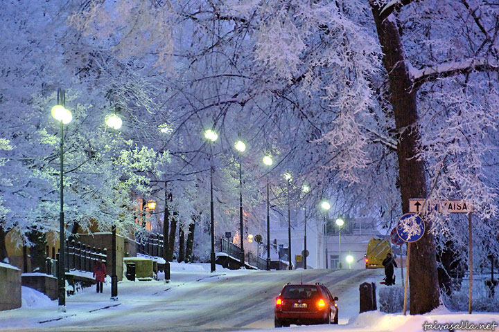 Helsinki: Kuuran kuorruttamat puunoksat kaareutuvat Unioninkadun yli talvi-illan hämärtyessä. (Ks. vastakkaisesta suunnasta kuvattu sumuinen yönäkymä: 23.12.2007.)