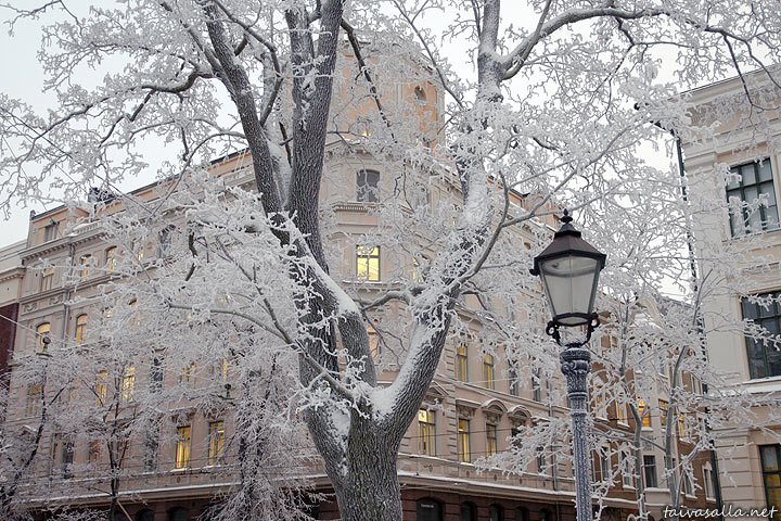 Helsinki: Kuuran kuorruttama puu Bulevardin ja Yrjönkadun kulmassa Vanhassa kirkkopuistossa ja Bulevardi 6:n rakennus Kampissa.
