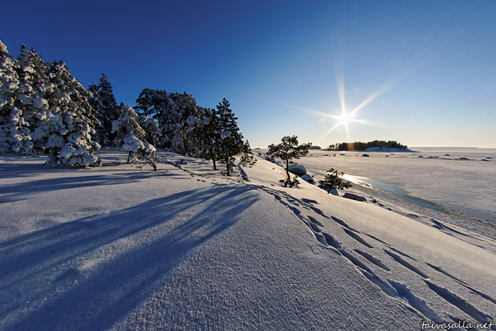 Tässä on aivan unelma pakkaskuva, raikasta, arktista ja avaraa, luntakin on paljon. Toivottavasti tulee vielä kunnon talvia. (Ei tarkoita sitä ettenkö olisi ihastunut tähän toukokuun runsaaseen vihreyteen ja helteeseen.)