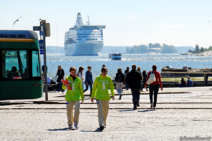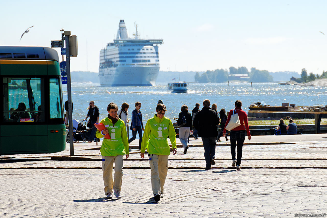 Helsinki: Merellinen näkymä Havis Amandan patsaalta Kauppatorilta kohti Eteläsatamaa. Helsinki Help -turistineuvojat ovat valmiina palvelemaan neuvoa kaipaavia matkaajia.