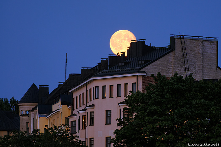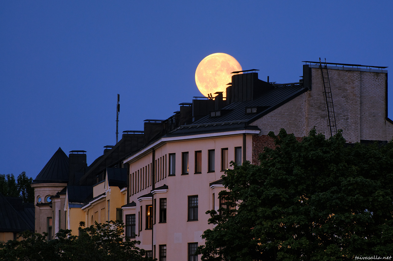 Helsinki: Kuu nousee Laivastokadun asuintalojen ylle 42 tuntia täyden vaiheensa jälkeen. Kuvattu kauniina kesäiltana Kruununhaan Pohjoisrannasta kohti Katajanokkaa.