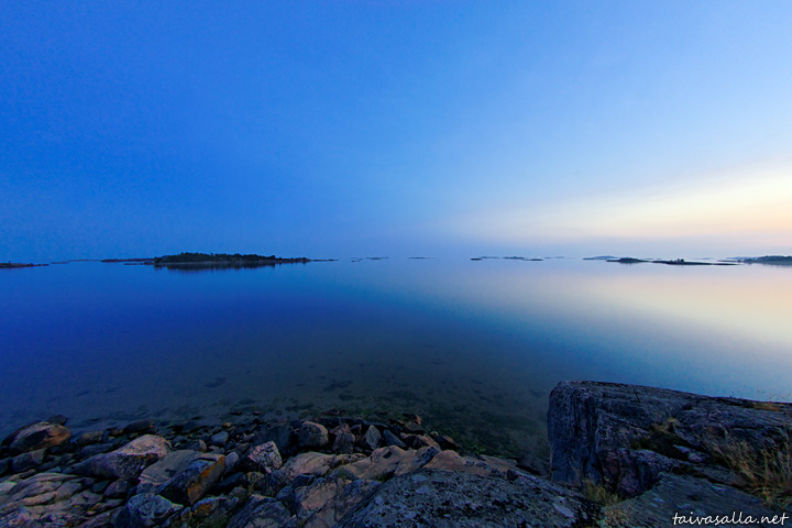 Hanko: View from the southern cliffs of Högholmen headland in Tvärminne, about 10 kilometres east of the city of Hanko in the southernmost part of Finland. Photo taken 45 minutes after sunset on a very calm late summer evening.