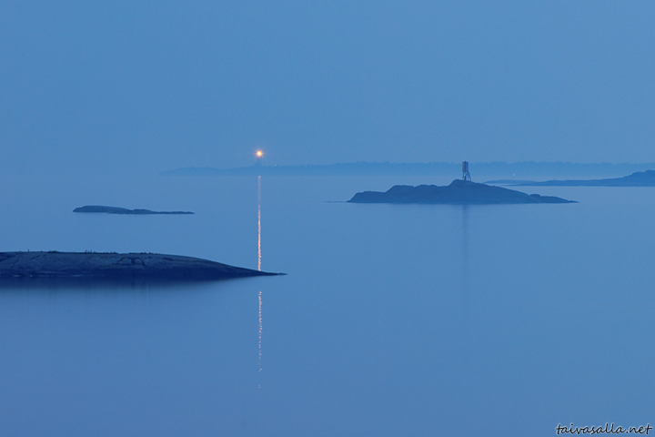 Hanko: Russarö lighthouse, also known as the Eye of Hanko, lights up the Gulf of Finland on a very calm late summer evening. View from the cliffs of Högholmen headland in Tvärminne, about 10 kilometres east of the city of Hanko in the southernmost part of Finland.
