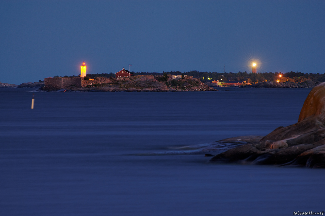 Hanko: Gustavsvärnin linnoitus- ja majakkasaari ja sen takana näkyvä Russarön saari majakoineen kuvattuna Hangon Gunnarsinrannasta Tulliniemen lähettyviltä. Kuvasin saman näkymän päivänvalossa 18.6.2008.
