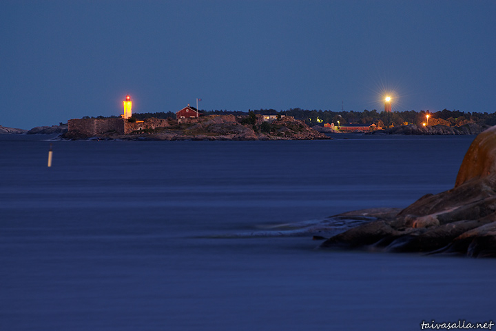 Hanko: Two lighthouses in front of Hanko, the southernmost city of Finland. The white lighthouse tower stands on Gustavsvärn, an island with ruins of fortifications built by the Swedes in the late 18th century. The other lighthouse is situated on Russarö, an island occupied by the Finnish Defence Forces. I captured the same view in daylight on 18 June 2008.