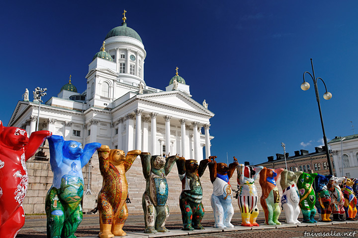 Helsinki: A few of the 142 bear statues in the United Buddy Bears exhibition on the Senate Square. Each bear represents one country recognised by the United Nations, and has been designed by an artist on behalf of his or her native country.