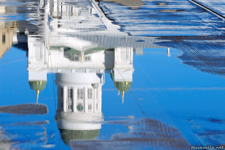 Helsinki: A reflection of the Lutheran Cathedral in a puddle on the tramway on Eteläranta street, close to the Old Market Hall and the Market Square.