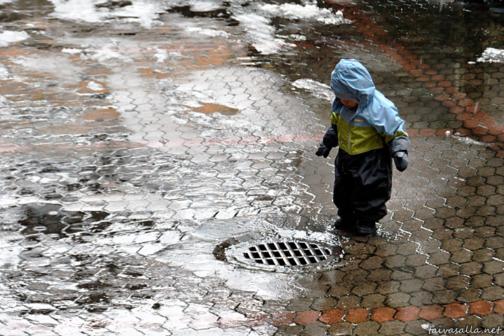 Helsinki: A little boy amazed by a street inlet on an inner court on Luotsikatu street in the district of Katajanokka. The snow that had fallen during the night quickly melted away.