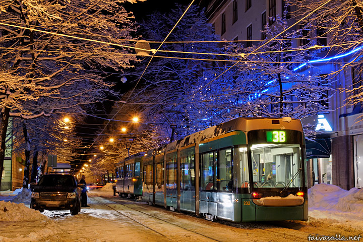 Helsinki: Two trams on routes 9 and 3B are waiting on Bulevardi street near the city centre, while one of the drivers cleans a switch jammed by the snow.