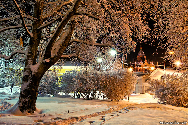 Helsinki: A snowy winter evening's view from the small park in front of the House of Nobility, next to Aleksanterinkatu street in the district of Kruununhaka. The church rising in the background is the Uspenski Cathedral, which is located in the district of Katajanokka.