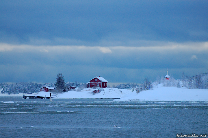 Helsinki: A wintry view from the Market Square towards two islands near the South Harbour. The cottages are situated on Ryssänsaari island, and the beacon is located on Valkosaari island.