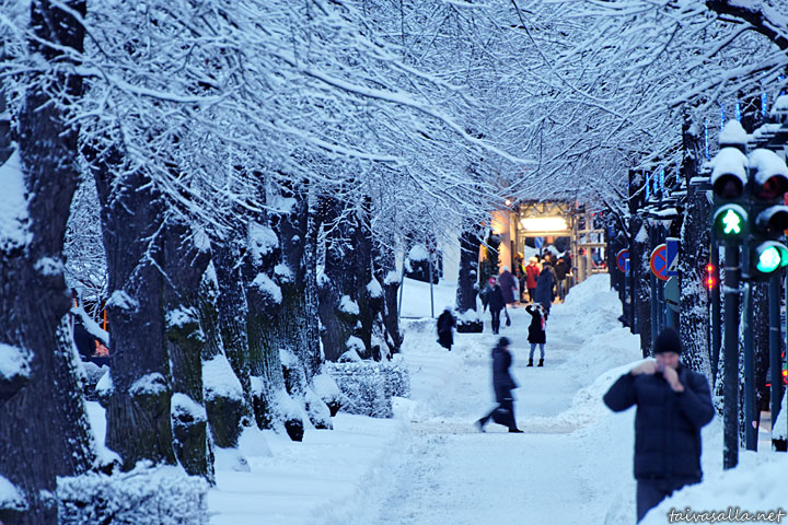 Helsinki: A wintry view from Pohjoisesplanadi street with people fascinated by the snowy trees. Picture taken nearby the Market Square towards the city centre.
