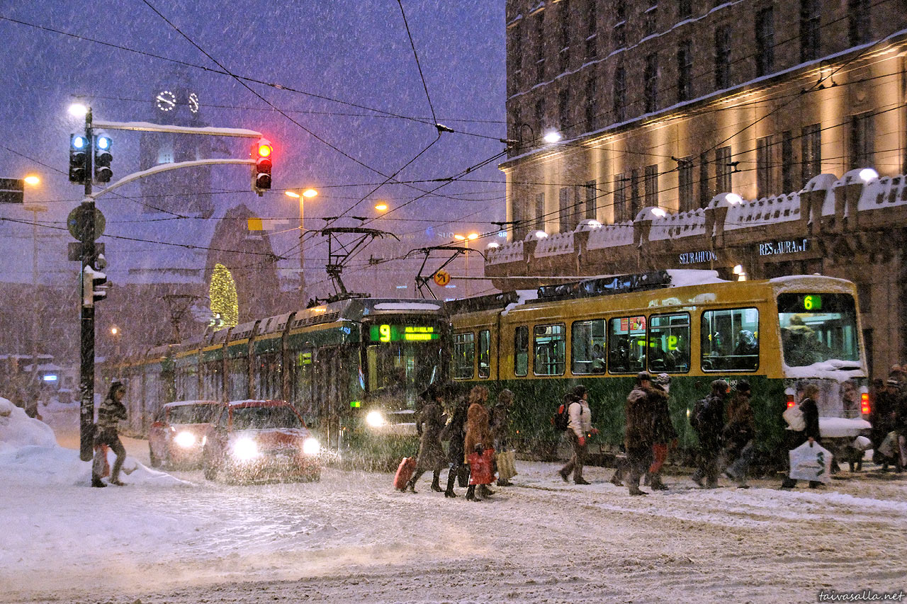 Helsinki: Dense snowfall in the crossing of Kaivokatu and Mannerheimintie streets in the city centre. In the background is the Central Railway Station and its tower.