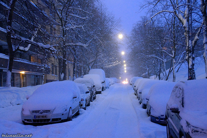 Helsinki: Blue evening twilight on Vuorimiehenkatu street in the district of Ullanlinna on a snowy winter day. Only one car is awake, while the others are resting under their fresh snow blankets.