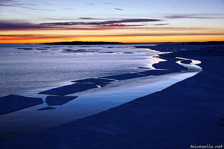 Helsinki: The edge of the ice cover cracks and shatters into ice floes between the islands of Harakka and Liuskasaari. Photo taken about half an hour after sunset from Harakka island near the district of Kaivopuisto.