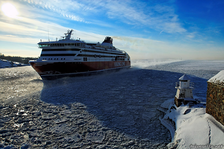 Helsinki: Viking XPRS saapumassa höyryävään Kustaanmiekan salmeen kylmänä talviaamuna. Oikealla näkyy Kustaanmiekan etelärantaa Suomenlinnassa loistoineen ja rantavarustuksineen. Kylmä sää oli muuttanut jääolosuhteita selvästi yhdeksän päivää aiemmin vallinneesta tilanteesta, ks. 10.2.2011.