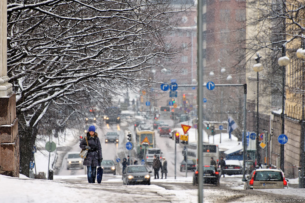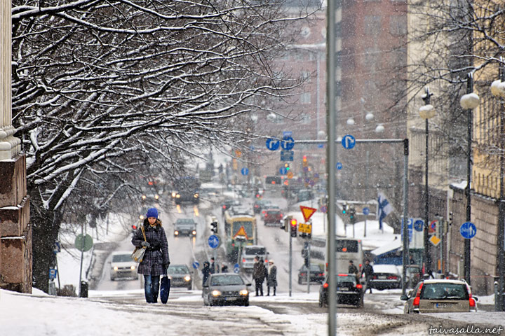 Helsinki: A snowy spring day's view from Unioninkatu street towards the district of Kallio.
