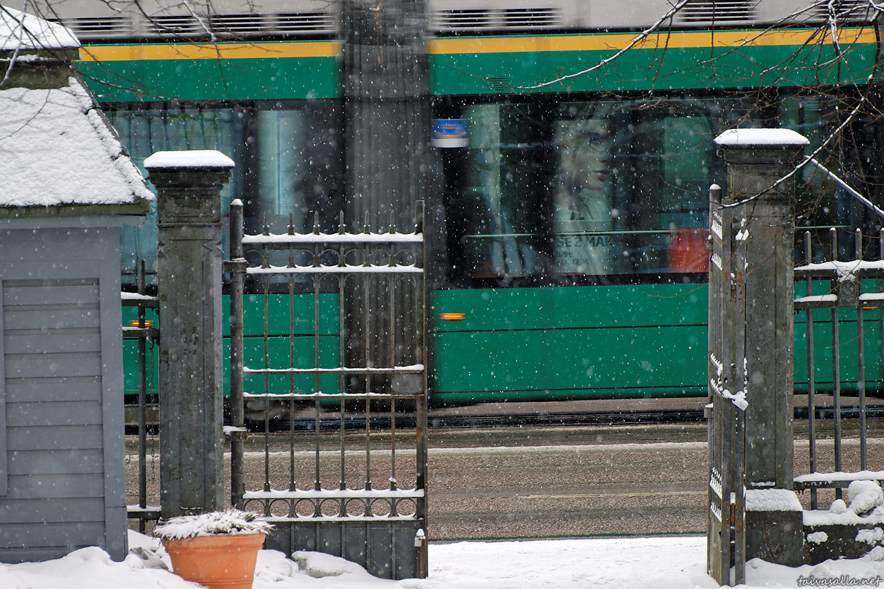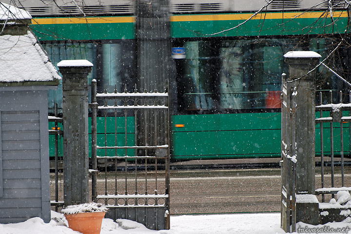 Helsinki: A tram on Unioninkatu street passes the gate of Kaisaniemi Botanic Garden on a snowy spring day.