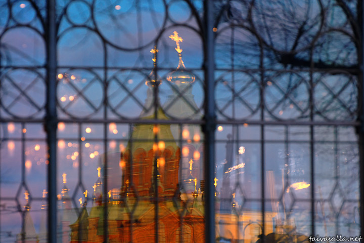 Helsinki: Keväisen ilta-auringon valaisema Uspenskin katedraali heijastuu ravintola Kappelin Unioninkadun puoleisista ikkunoista.
